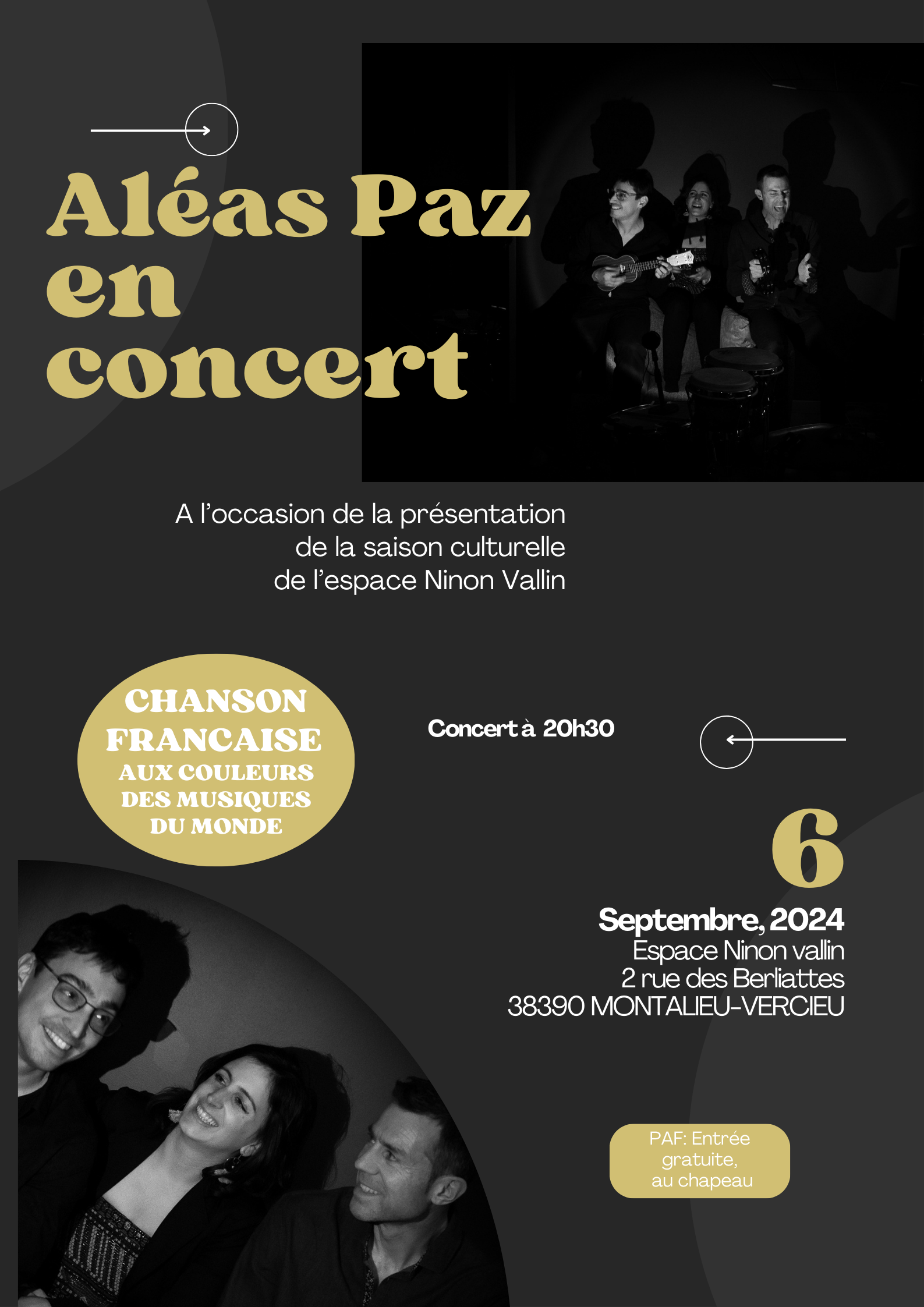 Participez à l’ouverture de la saison culturelle Ninon Vallin à MONTALIEU. Pour cette soirée de septembre, Aléas Paz proposera son spectacle de « chansons françaises aux couleurs de musiques du monde ».